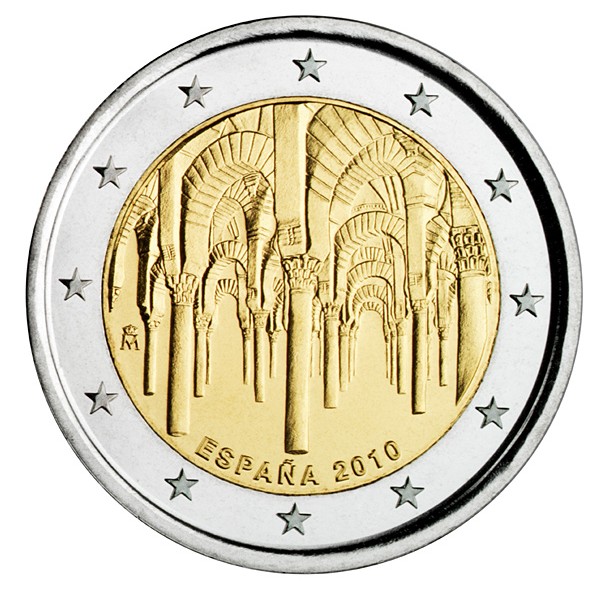The coin portrays the “forest of pillars” of the Great Mosque of Córdoba, one of the most significant and oldest examples of Islamic art in Europe. Built between the 8th and 10th centuries, the Mosque was later consecrated as a Christian cathedral and underwent a series of transformations. The coin is the first in a new series dedicated to the Spanish sites on the UNESCO’s World Heritage List. One such commemorative coin will be issued every year as from 2010. The coin’s outer ring bears the 12 stars of the European Union.