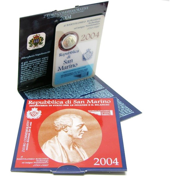 The twelve stars of the European Union positioned around the outer circle of the coin and the issuing year '2004', positioned bottom centre, surround the bust of Bartolomeo Borghesi. To the left of the bust is the inscription 'Bartolomeo Borghesi', and one above the other are the letter 'R' and the engraver's initials 'E.L.F.'. To the right of the bust is the word 'San Marino'.