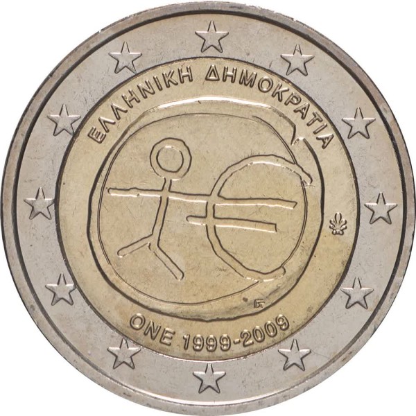The coin shows a stick figure which merges into the € symbol. It seeks to convey the idea of the single currency and, by extension, Economic and Monetary Union (EMU) being the latest step in Europe’s long history of trade and economic integration. The coin is issued by each euro area country and shows the name of the country as well as the legend ‘EMU 1999-2009’ in the respective language(s). The design was chosen out of a shortlist of five by members of the public across the European Union voting online. It was created by George Stamatopoulos, a sculptor from the Minting department at the Bank of Greece. The coin’s outer ring bears the 12 stars of the European Union.