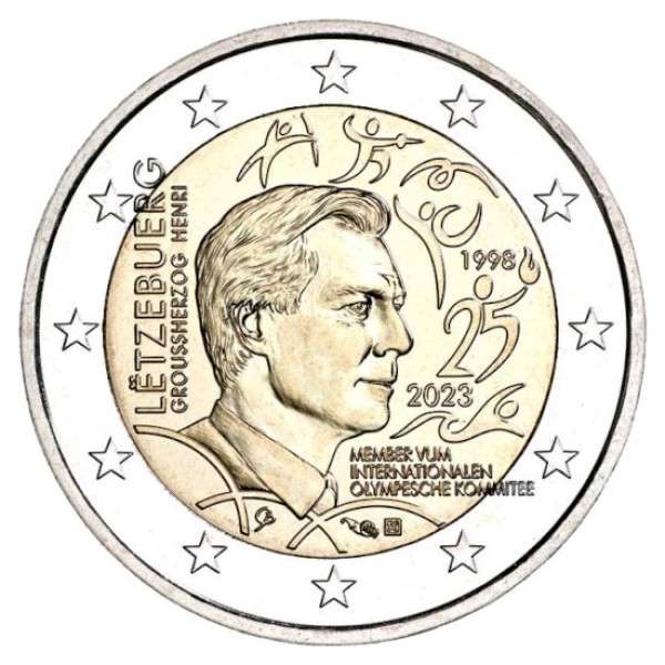 The coin depicts Grand Duke Henri of Luxembourg in the center of the obverse. The portrait of the Duke is flanked by several icons of Olympic sports. On the right-hand side, the text 'MEMBER VUM INTERNATIONALEN OLYMPESCHE KOMMITEE' and the name of the country 'LËTZEBUER' are embossed. The outer part of the coin depicts the twelve stars of the flag of the European Union.