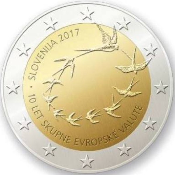 The Republic of Slovenia is issuing a 2-euro commemorative coin to mark the 10th anniversary of Slovenia’s introduction of the euro, an event that made it a member of the euro area and part of the Eurosystem, which uses the euro as currency. In addition to inscriptions, there is an image on the coin of ten swallows, which have great importance in folk heritage, and whose flight in the direction of the hour hand symbolises progress and development.