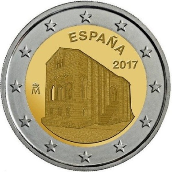 The central area of the coin reproduces an image of the church of Santa Maria del Naranco. At the top and capitalizated the issuign country SPAIN. Below the year of issue 2017 and to the left of the central motif the mintmark.