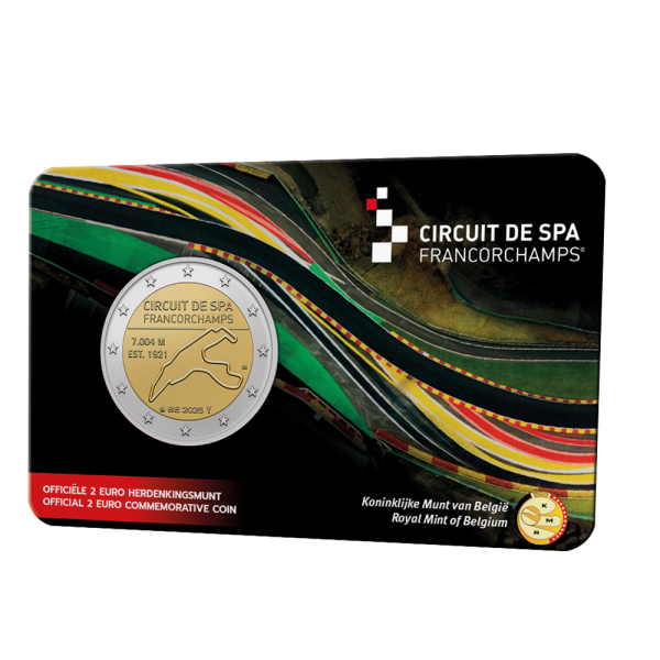 The obverse of this coin features a stylized representation of the Spa-Francorchamps circuit layout. The precise lines evoke the legendary bends, including Eau Rouge and Raidillon. At the top of the coin is the inscription “CIRCUIT DE SPA FRANCORCHAMPS”, translated into French as “Circuit de Spa-Francorchamps”. In addition, two technical notes appear: “7.004 M”, for the length of 7.004 kilometers, and “EST. 1921”, meaning “Establishment in 1921”. These elements recall the antiquity and historical dimension of the circuit. Furthermore, at the bottom of the coin, one can read “BE 2025”, where “BE” indicates the issuing country, Belgium. The twelve stars surrounding the central part recall the country’s membership in the eurozone. In addition, the minimalist design highlights the elegance of the engraving and the clarity of the inscriptions. The fine details give this piece a modern and commemorative character.