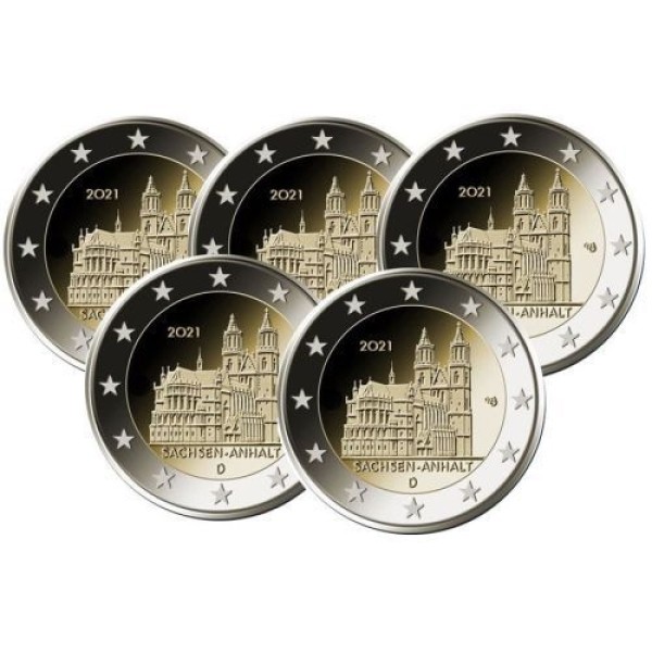 The design shows the Magdeburg Cathedral, the first Gothic-style cathedral to be constructed on German soil. The inner part also features the name ‘SACHSEN-ANHALT’ and the issuing country’s country code ‘D’ at the bottom, the mint mark of the respective mint (‘A’, ‘D’, ‘F’, ‘G’ or ‘J’) as well as the the year ‘2021’ on the left and the engraver’s mark on the right. The coin’s outer ring bears the 12 stars of the European flag.