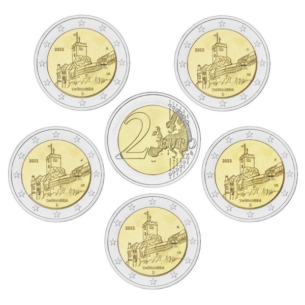 The coins depict the Castle of Vartburg, which is the most well-known brick castle of the noble Ludovinger dynasty, and it is one of the best preserved medieval castles in Germany. On the left side of the coin is the year of issuance '2022', at the bottom is the name of the German länder 'THÜRINGEN' and the mintmark. On the other side, the usual reverse of the 2-euro coin.