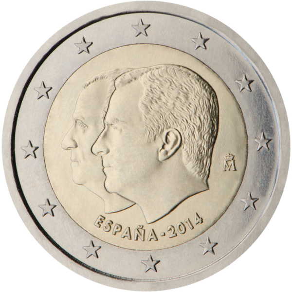 The design depicts the overlapping portraits of Kings Felipe VI and Juan Carlos I. At the bottom the name of the issuing country and the year of issuance: ‘ESPAÑA - 2014’. At the right, the mint mark. The coin’s outer ring bears the 12 stars of the European Union.