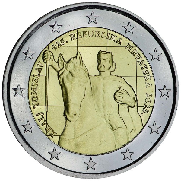 The national side of the commemorative coin features the main motif of King Tomislav on a horse. The background of the main motif features Croatia’s distinctive symbol, the Croatian checkerboard, which represents part of the coat of arms of the Republic of Croatia laid down in the Act on the Coat of Arms, Flag and Anthem of the Republic of Croatia and on the Flag and the Sash of the President of the Republic of Croatia (Official Gazette 55/1990, 26/1993 and 29/1994). The coin also features the following inscriptions: “KRALJ TOMISLAV” (King Tomislav), the year of coronation of King Tomislav “925.”, the issuing country “REPUBLIKA HRVATSKA” (Republic of Croatia) and the year of issuance “2025.”, which are inscribed circularly along the edge of the coin’s core.