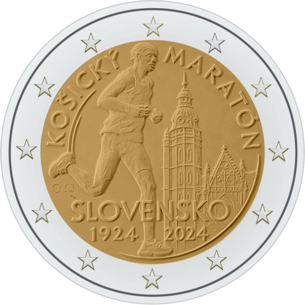 The design depicts, on the left side, a marathon runner and, on the right side, a detail of St Elizabeth’s Cathedral, one of the architectural landmarks of Košice. Inscribed across the lower part of the design are the name of the issuing country ‘SLOVENSKO’ and, below it, the marathon’s inaugural year ‘1924’ and the coin’s year of issuance ‘2024’. The inscription ‘KOŠICKÝ MARATÓN’ runs along the edge of the upper half of the design. Next to the lower left edge is the mint mark of the Kremnica Mint (Mincovňa Kremnica), consisting of the letters ‘MK’ placed between two dies. To the right of it are the stylised initials ‘LR’, referring to the national side’s designer Roman Lugár. The coin’s outer ring bears the 12 stars of the European flag.
