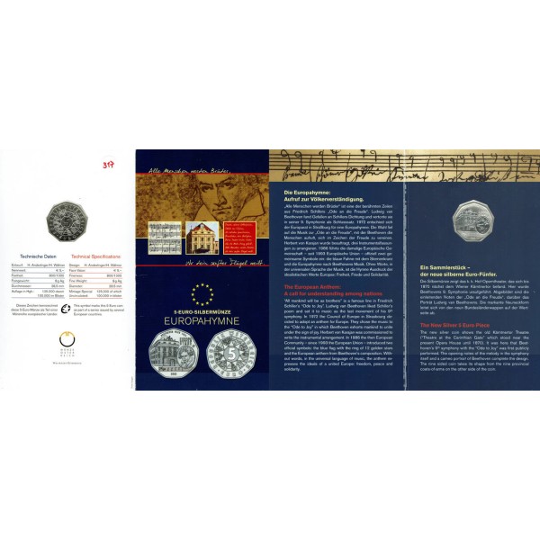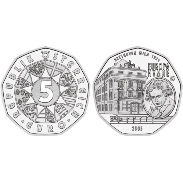 Obverse: The numeral “5” is encircled by the heraldic shields of Austria’s nine federal states (Burgenland, Carinthia, Lower Austria, Upper Austria, Salzburg, Styria, Tyrol, Vorarlberg, and Vienna). The inscription REPUBLIK ÖSTERREICH wraps around the rim. EURO is centered between two dots at the bottom. This design remains constant for all Austrian 5 euro silver coins struck to date. The reverse side of the coin shows the old Kärntnertor Theatre ("Theatre at the Carinthian Gate" which stood near the present Opera House until 1870). It was here that Beethoven's 9th symphony with the "Ode to Joy" was first publidly performed. The opening notes of the melody in the symphony itself and a cameo portrait of Beethoven complete the design.