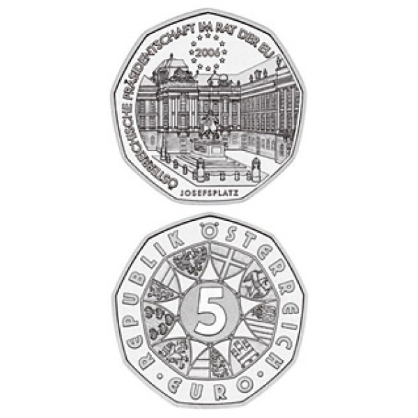 Obverse: The numeral “5” is encircled by the heraldic shields of Austria’s nine federal states (Burgenland, Carinthia, Lower Austria, Upper Austria, Salzburg, Styria, Tyrol, Vorarlberg, and Vienna). The inscription REPUBLIK ÖSTERREICH wraps around the rim. EURO is centered between two dots at the bottom. This design remains constant for all Austrian 5 euro silver coins struck to date. The reverse side of the silver coin shows the Vienna Hofburg in the square called the "Josefsplatz" after the equestrian statue of Joseph II in its centre. The wing of the Hofburg to the right contains the Spanish Riding School and the so-called "Redoutensäle", which will be the venue for many of the meetings and conferences during the Austrian presidency.