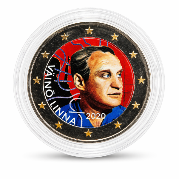 The coin celebrates the well-known late Finland writer Väinö Linna. This year marks the centenary of his birth in 1920. The design reflects Linna’s work in a textile mill and depicts, in addition to his face, letters as weaved fabric and threads that run through his books. The inscription VÄINÖ LINNA is at the left side. At the bottom are the inscriptions of the year of issuance ‘2020’, of the issuing country ‘FI’ and the mintmark. The coin’s outer ring bears the 12 stars of the European flag.
