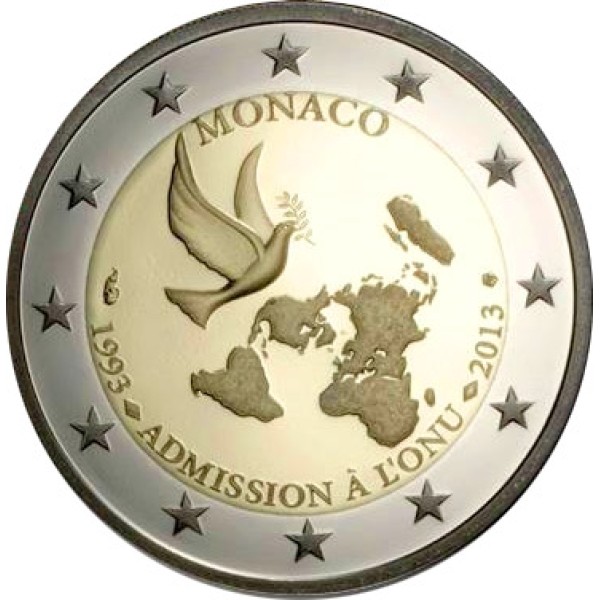 The coin depicts a dove with an olive branch, with in the middle of the arc, on the left side the cornucopia, and on the right side the punch, as the workshop Paris Mint mark. At the top, in semi-circle, the indication of the issuing country ‘MONACO’ and at the bottom, in semi-circle, the inscription ‘1993 ADMISSION À L'ONU 2013’. The coin’s outer ring bears the 12 stars of the European Union.