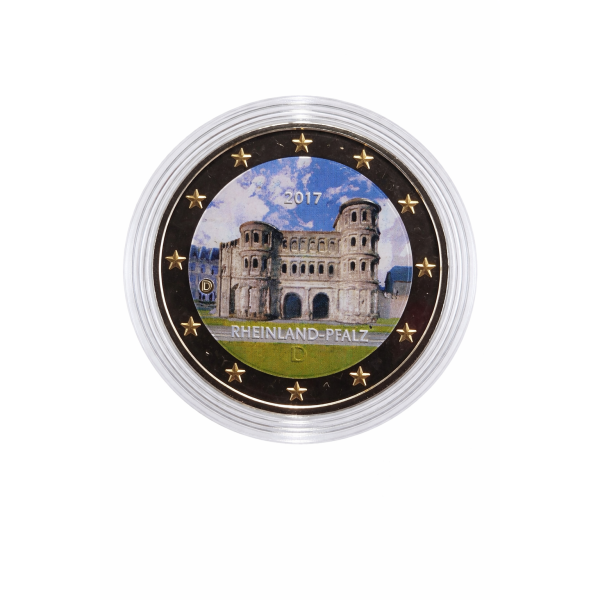 The design shows the Porta Nigra in Trier which is probably the best-preserved Roman city gate north of the Alps. The inner part also features the name ‘RHEINLAND-PFALZ’ and the issuing country’s code ‘D’ at the bottom. The mint mark of the respective mint (‘A’, ‘D’, ‘F’, ‘G’ or ‘J’) appears at the left and the year ‘2017’ appears at the top. At the right, the initials of the designer ‘CH’ (Chocola Frantisek). The coin’s outer ring bears the 12 stars of the European Union.