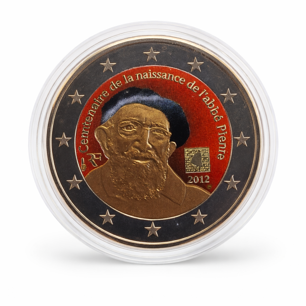 The inner part of the coin shows a portrait of Abbé Pierre wearing his well-known beret, positioned slightly off-centre to the left, and the logo of the foundation that bears his name to the right, including micro-lettering with the question “Et les autres?”, his favourite words to remind us that we should never forget to help others. The inscription “Centenaire de la naissance de l’abbé Pierre” forms an arch around the portrait along the edge of the coin’s inner part, flanked by the horn of plenty (mintmark of Monnaie de Paris) and the letters “RF” to denote the issuing country on the left and the “fleurette” (hallmark of the engraving workshop) on the right. The coin’s outer ring bears the 12 stars of the European Union.