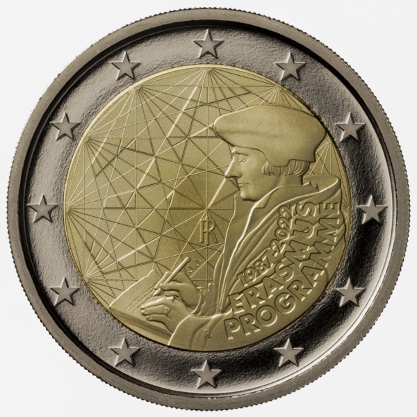 The coin dedicated to the Erasmus+ student mobility programme is a joint commemorative coin, which means it is issued in all the countries of the euro area. The coin was designed by Joaquin Jimenez.