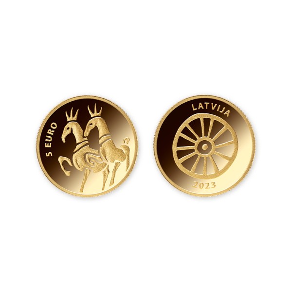 a carriage wheel in the centre of the coin, the inscription "LATVIJA"