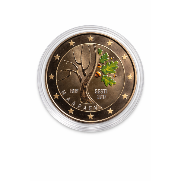 The coin features the sinuous trunk of an oak tree where on one side there are depicted the branches and on the other side the leaves. The branches symbolize the time of revolutions and hardships from which the road to Estonia's Independence was paved. The leaves symbolize the strength, achievements and longevity of Estonia. At the bottom left side of the trunk there is the word ‘MAAPÄEV’ (Provisional Assembly of Estonia) and above that the year ‘1917’. At the bottom right side there is the name of the issuing country ‘EESTI’ and below that the year of issuance ‘2017’. The coin’s outer ring bears the 12 stars of the European Union.