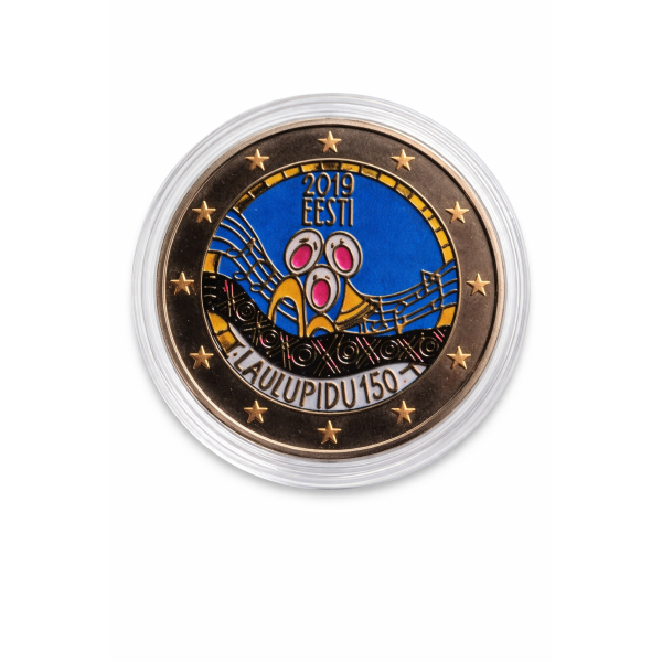 The design is inspired by the Song Celebration procession, which moves like the waves on the sea with cheers of pride and joy and a panoply of national dress. The design unites music, national costumes, and the various sites of the great and powerful Song Celebration of the nation by the sea. The design also features the first notes of the Estonian national anthem and, at the bottom, the words ‘Laulupidu 150’ (Song Celebration 150). At the top is the year of issuance ‘2019’ and underneath the name of the issuing country ‘EESTI’. The coin’s outer ring bears the 12 stars of the European Union.