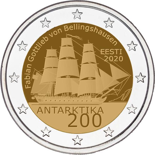 The discovery is linked to Estonia because one of the first men to see Antarctica in 1820 was Fabian Gottlieb von Bellingshausen, a Baltic German seafarer born in Saaremaa, who documented the discovery. The design depicts a motif of a sailing ship. It also bear the inscriptions ‘Fabian Gottlieb von Bellingshausen’ and ‘ANTARKTIKA 200’, the country name ‘EESTI’ and the year of issuance ‘2020’. The coin’s outer ring bears the 12 stars of the European flag.