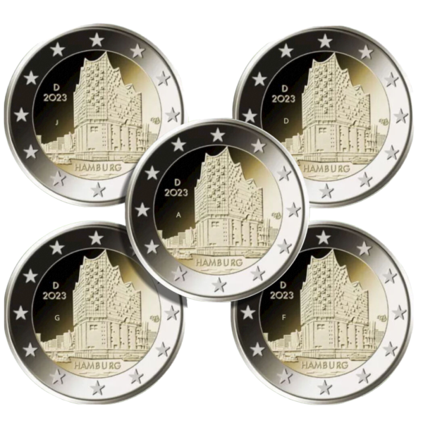 The design shows the Elbphilharmonie concert hall, Hamburg’s newest landmark. The impressive and detailed representation of the concert building against the background of the maritime urban landscape represents the Land of Hamburg in an exceptionally convincing manner. The left half of the coin’s inner section includes Germany’s issuing country code, ‘D’, the year ‘2023’ and the mintmark of the respective mint (‘A’, ‘D’, ‘F’, ‘G’ or ‘J’). The right half features the artist’s initials, and the lower part features the inscription ‘HAMBURG’.