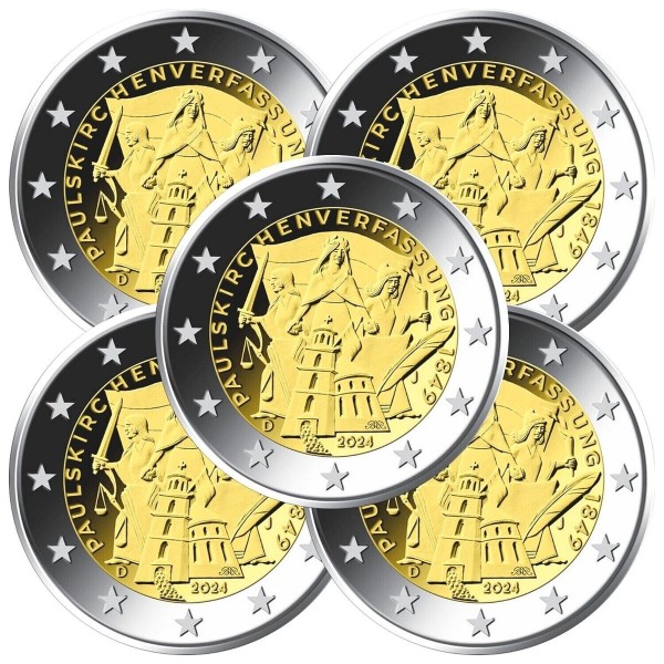The inner part of the coin also displays the inscription "Paulskirche Constitution 1849" and, in the lower area, the year of issue "2024," the country code "D" for the issuing country Germany, the mint mark of the respective mint ("A," "D," "F," "G," or "J"), and the artist's initials. On the outer ring of the national side, the twelve stars of Europe are arranged.