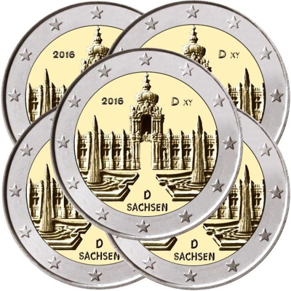 The design shows a view of the world-famous Zwinger Palace in Dresden, namely of the inner yard giving way to the Crown Gate. It includes the name ‘SACHSEN’ (Saxony) and the country code ‘D’ at the bottom, the mint mark of the respective mint (‘A’, ‘D’, ‘F’, ‘G’ or ‘J’) as well as the engraver’s mark (the initials ‘JT’ for Jordi Truxa) at the top right and the year ‘2016’ at the top left. The coin’s outer ring bears the 12 stars of the European Union.