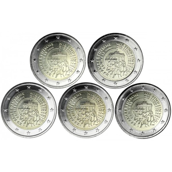 The people in the foreground, who embody a new beginning and the advance towards a better future, are standing in front of the Brandenburg Gate, symbol of German unity. The rendering of the statement Wir sind ein Volk (‘we are one people’) — a collective expression of will by German citizens – represents the path forwards towards German reunification. The inner part also features the mint mark of the respective mint (‘A’, ‘D’, ‘F’, ‘G’ or ‘J’) as well as the issuing country’s country code ‘D’ and the engraver’s mark (the initials ‘BW’ — Bernd Wendhut). The coin’s outer ring bears the 12 stars of the European Union.