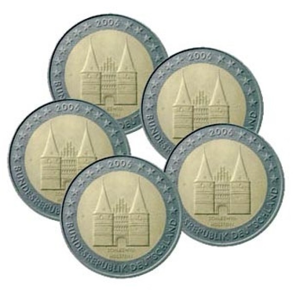 The Holstentor, the gate symbolising of the town of Lübeck, is shown in the centre of the coin and below it the word ‘Schleswig-Holstein’, the first of Germany’s 16 federal states to be commemorated in a euro coin. The engraver’s initials ‘HH’ appear to the right of the image and the mintmark ‘A’, ‘D’, ‘F’, ‘G’ or ‘J’, depending on the mint, to the left. The year of mintage, 2006, the 12 stars of the European Union and the words ‘Bundesrepublik Deutschland’ are shown in the outer ring.