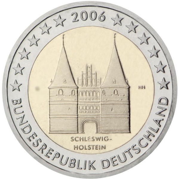The Holstentor, the gate symbolising of the town of Lübeck, is shown in the centre of the coin and below it the word ‘Schleswig-Holstein’, the first of Germany’s 16 federal states to be commemorated in a euro coin. The engraver’s initials ‘HH’ appear to the right of the image and the mintmark ‘A’, ‘D’, ‘F’, ‘G’ or ‘J’, depending on the mint, to the left. The year of mintage, 2006, the 12 stars of the European Union and the words ‘Bundesrepublik Deutschland’ are shown in the outer ring.