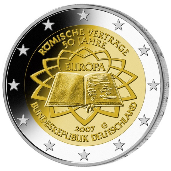 The coin shows the Treaty document signed by the six founding countries on a background evoking the paving (designed by Michelangelo) of the Piazza del Campidoglio in Rome, where the signing took place on 25 March 1957. ‘Treaty of Rome 50 years’, ‘EUROPE’ and the name of the issuing country appear in the respective languages of the euro area or in Latin. Thus, the legend differs from country to country, but the image is the same. The Treaty of Rome established the European Economic Community and ultimately led to the introduction of the euro in 1999 and the euro banknotes and coins in 2002. The anniversary was celebrated on 25 March 2007. The euro area countries have marked the occasion by jointly issuing this commemorative coin. Its design was selected following a competition organised by the European mints. The coin’s outer ring bears the 12 stars of the European Union.