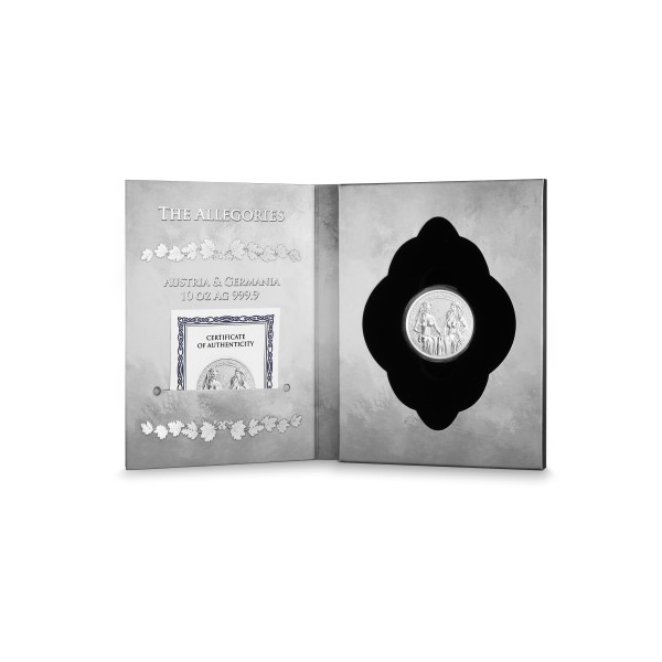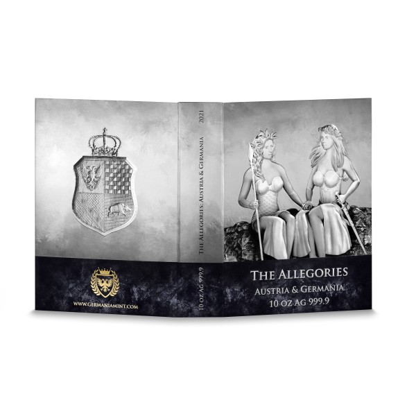 Austria & Germania is the fourth coin from Germania Allegories, coming to Collectors in 2021. The whole series depicts personifications of countries around the world in a form of beautiful, sensual and strong women. The Allegories coins are created in one diameter of 38.61 mm and four different heights and weights, from 3 mm for 1 oz coin to 25.85 mm for 10 oz coin, which is exceptional not only because of its thickness the blanks, from which it has been minted, were processed manually.