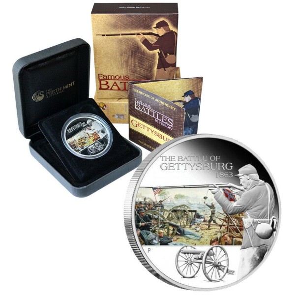 Tuvalu – Battle of Gettysburg – $1 – 2009 – Proof Silver Coin – Mint Box & COA – The Battle of Gettysburg was the historic turning point in the American Civil War where Union forces under the command of General George Meade repulsed the Confederate army led by General Robert E Lee. During the opening clashes on 1 July 1863, Confederacy troops took the early initiative north of Gettysburg, forcing the Union side to form a defensive line on high ground to the south of the town. Full-scale battle began on the second day, but the attack by the Confederacy was only partially successful in dislodging Union defenders from their positions. On the climactic third day, Confederate guns bombarded the Union centre on Cemetery Ridge. The infantry