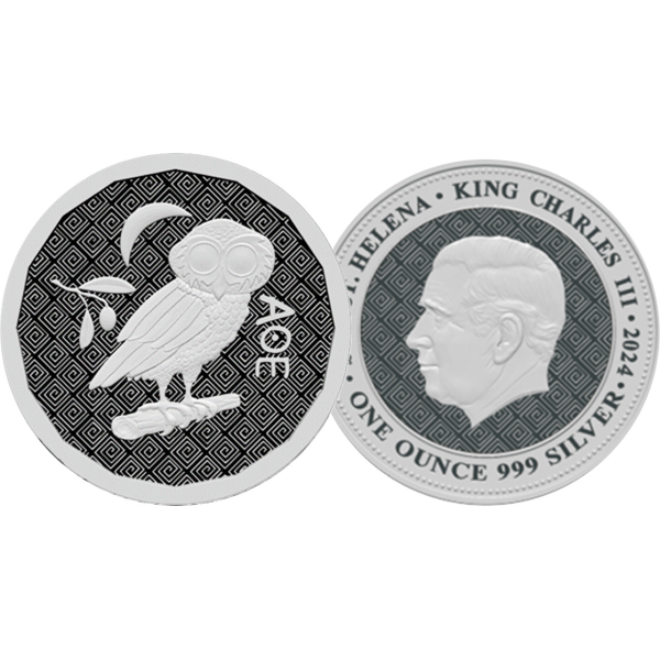 The 2024 Athenian Owl silver coin, part of the increasingly popular Athenian Owl bullion series, offers an ideal investment opportunity for those who are looking to diversify their portfolios. Minted by the Silver Towne Mint with a pure Ag.999 silver content, weighing one troy ounce, and measuring 39 mm in diameter, this coin is a valuable addition. The unlimited mintage is guaranteed by the government of Saint Helena, making it a legal tender in the country. The obverse features the image of King Charles III, along with details about the denomination, weight, date of issue, and minting attempt. On the reverse, an Athenian owl perches on a branch against a backdrop of the olive branch of peace and the moon, accompanied by the inscription "AOE."