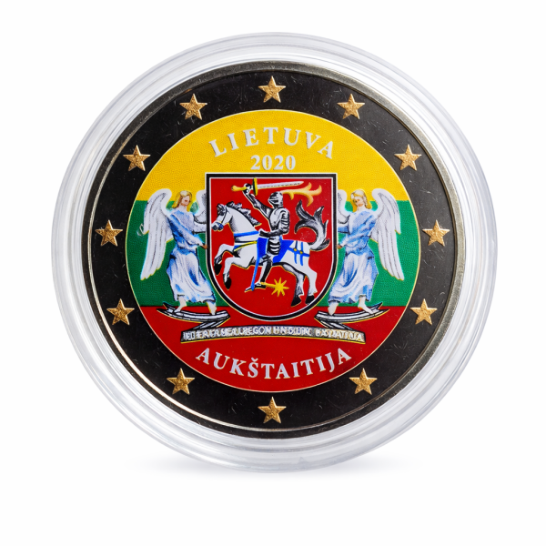 The design features a coat of arms with an armour-clad knight holding a sword in his right hand. The coat of arms is held by two angels, simbolically exalting and protecting Aukštaitija – one of the most important regions of Lithuania and the cradle of its statehood. Below is a Latin inscription PATRIAM TUAM MUNDUM EXISTIMA (CONSIDER YOUR HOMELAND TO BE THE WHOLE WORLD). The design is surrounded by inscriptions: ‘LIETUVA’ (the name of the issuing country), ‘AUKŠTAITIJA’, the year of issuance ‘2020’ and the mintmark of the Lithuanian Mint. The coin’s outer ring bears the 12 stars of the European flag.