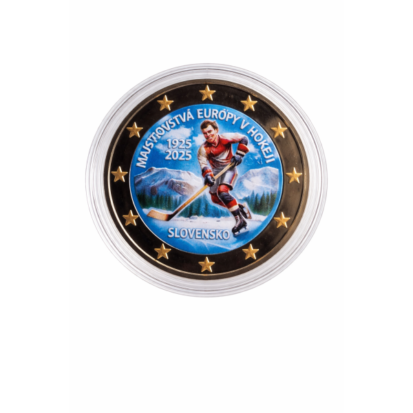 At the top, the inscription “MAJSTROVSTVÁ EUROÓPY V HOKEJI” highlights the commemorated event, the European Hockey Championships. To the left of the player, the years “1925” and “2025” mark the year of the first tournament and the year of issue of the coin, respectively. At the bottom, the inscription “SLOVENSKO” clearly indicates the issuing country.