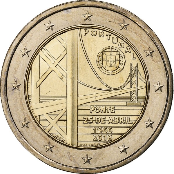 Center of the coin depicts Lisbon  (April 25) suspension bridge. The upper part of the coin is inscribed the name of the State PORTUGAL and coat of arms of Portugal, inscription below the bridge PONTE 25 DE ABRIL, and far below the jubilee years 1966 - 2016th., next side - regular 2€ denomination number.
