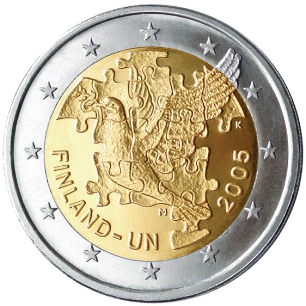 Depicted in the centre of the coin are parts of a jigsaw puzzle showing a dove of peace. Below the image of the dove, inscribed along the edge of the bottom half of the central part of the coin, the inscription ‘FINLAND — UN’ appears on the left and the year of issue on the right. Above the last figure of the year of issue, set close to the edge of a piece of the jigsaw puzzle, is the letter ‘K’, the engraver's initial. The mintmark ‘M’ is inscribed immediately below the image of the dove of peace. The outer ring features the 12 stars of the European Union.