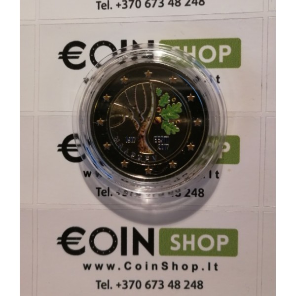 The coin features the sinuous trunk of an oak tree where on one side there are depicted the branches and on the other side the leaves. The branches symbolize the time of revolutions and hardships from which the road to Estonia's Independence was paved. The leaves symbolize the strength, achievements and longevity of Estonia. At the bottom left side of the trunk there is the word ‘MAAPÄEV’ (Provisional Assembly of Estonia) and above that the year ‘1917’. At the bottom right side there is the name of the issuing country ‘EESTI’ and below that the year of issuance ‘2017’. The coin’s outer ring bears the 12 stars of the European Union.