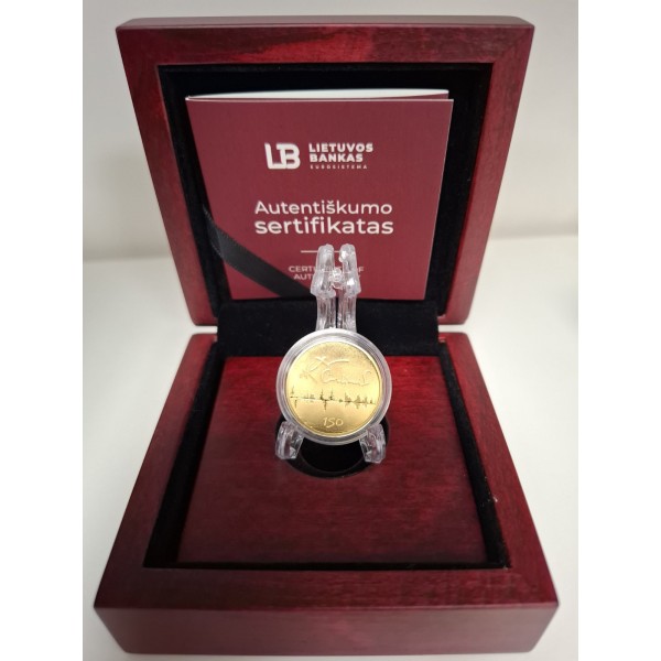 Obverse: A fragment of a reduced copy of REX, one of M. K. Čiurlionis’ most famous paintings. The artist’s work appears as if immortalized in gold. The fragment is encircled by the inscriptions “Lietuva,” the denomination “50 €,” the year 2025, as well as the manufacturer’s logo and the initials of the project’s author.