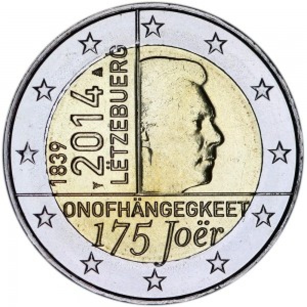 The coin depicts on the right hand side of its inner part the effigy of His Royal Highness, the Grand-Duke Henri, looking to the right, and on the left hand side of its inner part, vertically positioned, the years ‘1839’ and ‘2014’ and the name of the issuing country ‘LËTZEBUERG’. The inscriptions ‘ONOFHÄNGEGKEET’ and ‘175 Joër’ appear at the bottom of the inner part of the coin. The coin’s outer ring bears the 12 stars of the European Union.